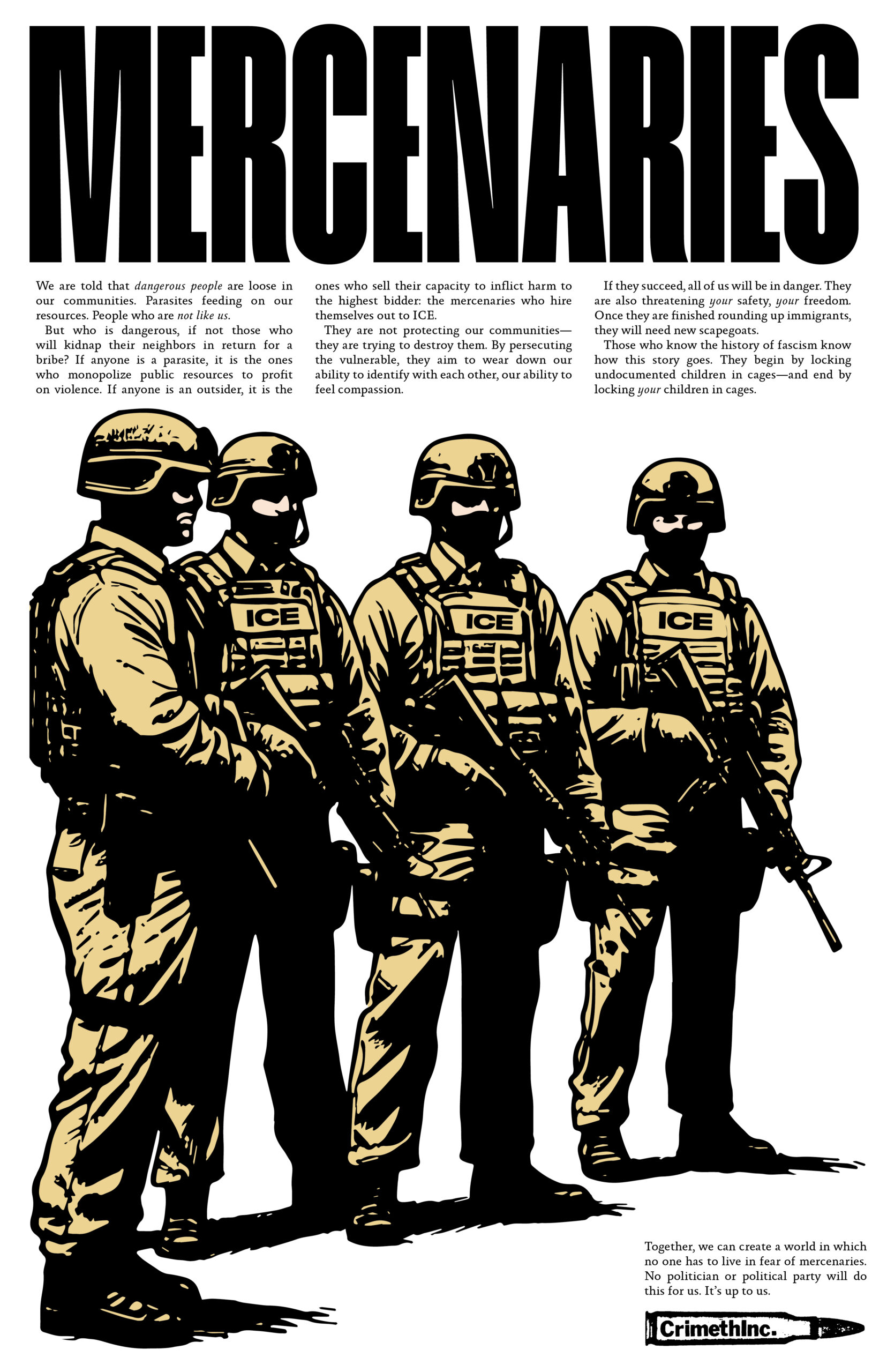 But who is dangerous, if not those who will kidnap their neighbors in return for a bribe? If anyone is a parasite, it is the ones who monopolize public resources to profit on violence. If anyone is an outsider, it is the ones who sell their capacity to inflict harm to the highest bidder: the mercenaries who hire themselves out to ICE.
