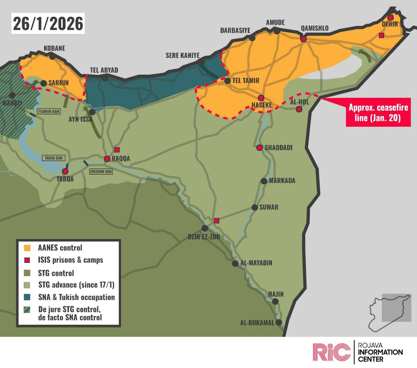 Three days later, the Syrian government attacked Rojava as a whole. On January 18, Syrian president Ahmed al-Sharaa announced a ceasefire agreement with the SDF, but fighting resumed immediately. Rojava faced the threat of a full-scale war of extermination, including the possibility that the Turkish military would invade once again. On January 20, the SDF agreed to a ceasefire stipulating that the region will be subordinated to the Syrian government in Damascus and the SDF will be integrated into the Syrian military. Yesterday, this ceasefire was extended; but as of now, parts of Rojava remain under siege.