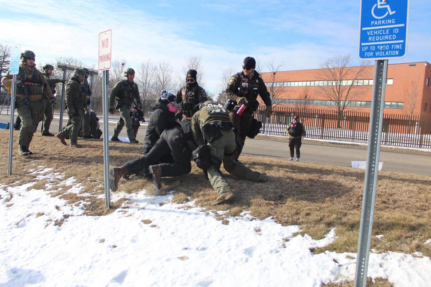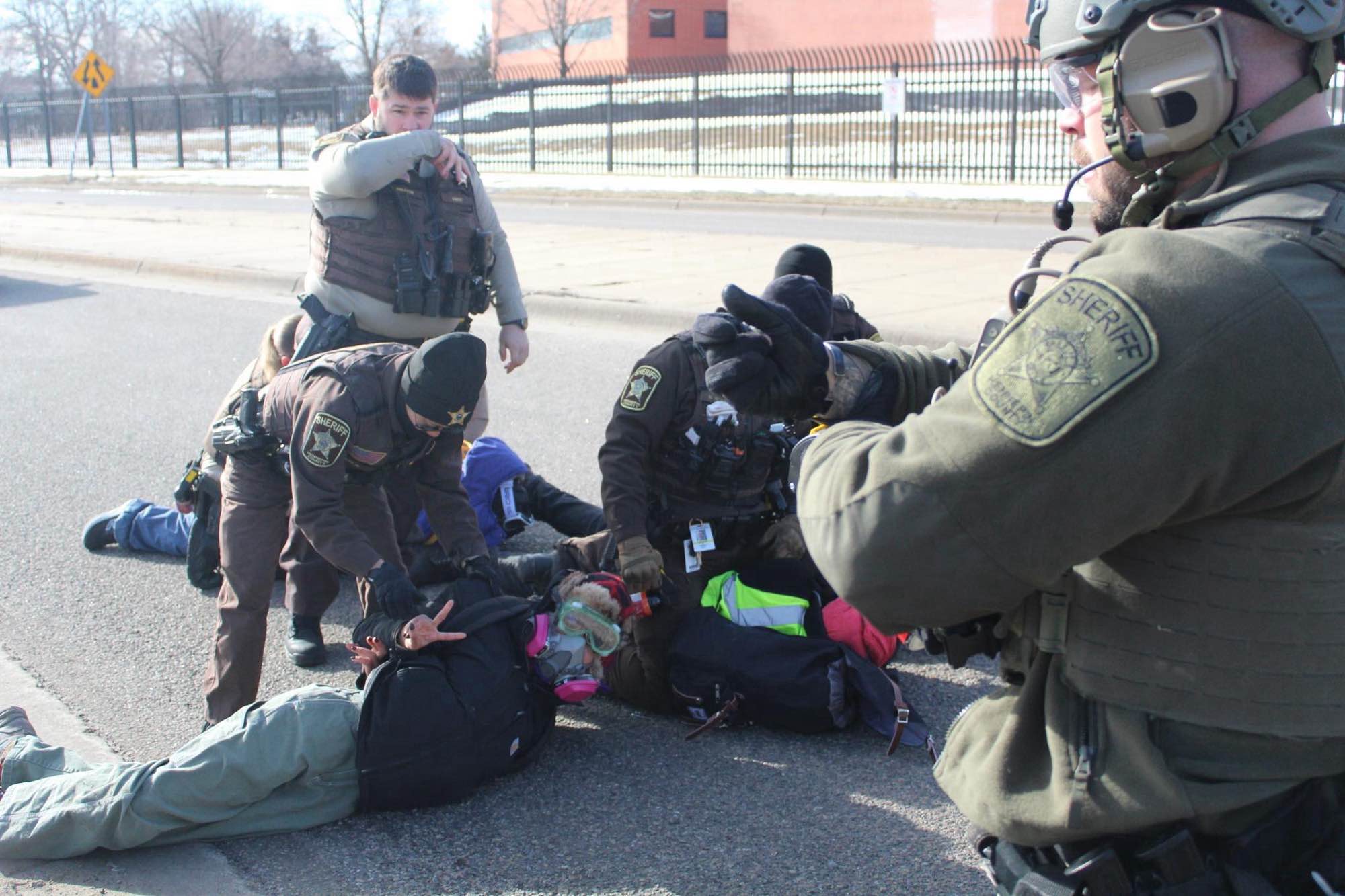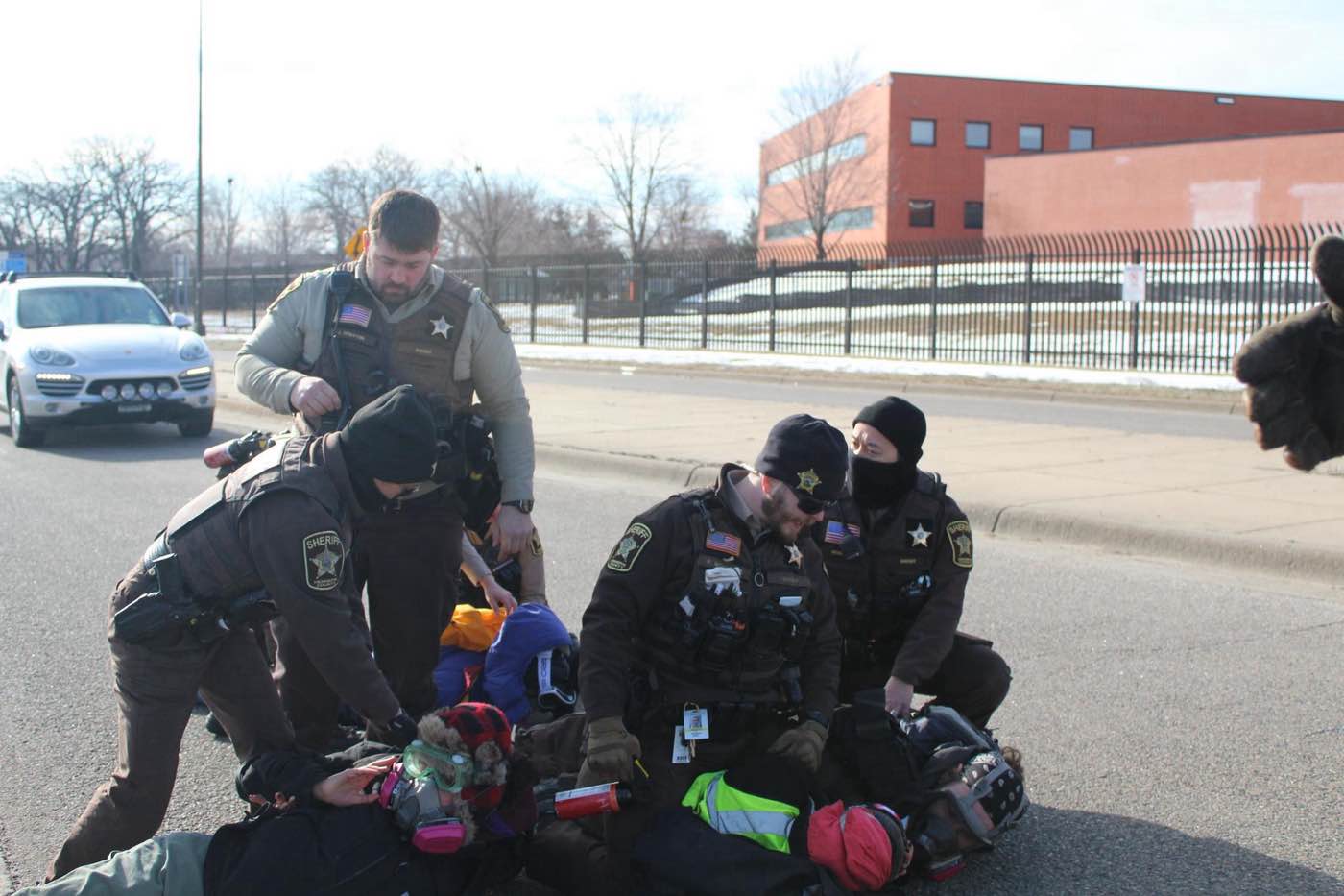 A line of sheriffs blocked our path before we reached our intended blockade point. Some of them were in normal uniforms; others were in full kit tactical gear, looking almost exactly like the federal agents who guarded this area in the recent past. One of them menaced us with a can of bear spray. I fiddled with my goggles, frantically trying to stop the damn things from fogging up in the cold.