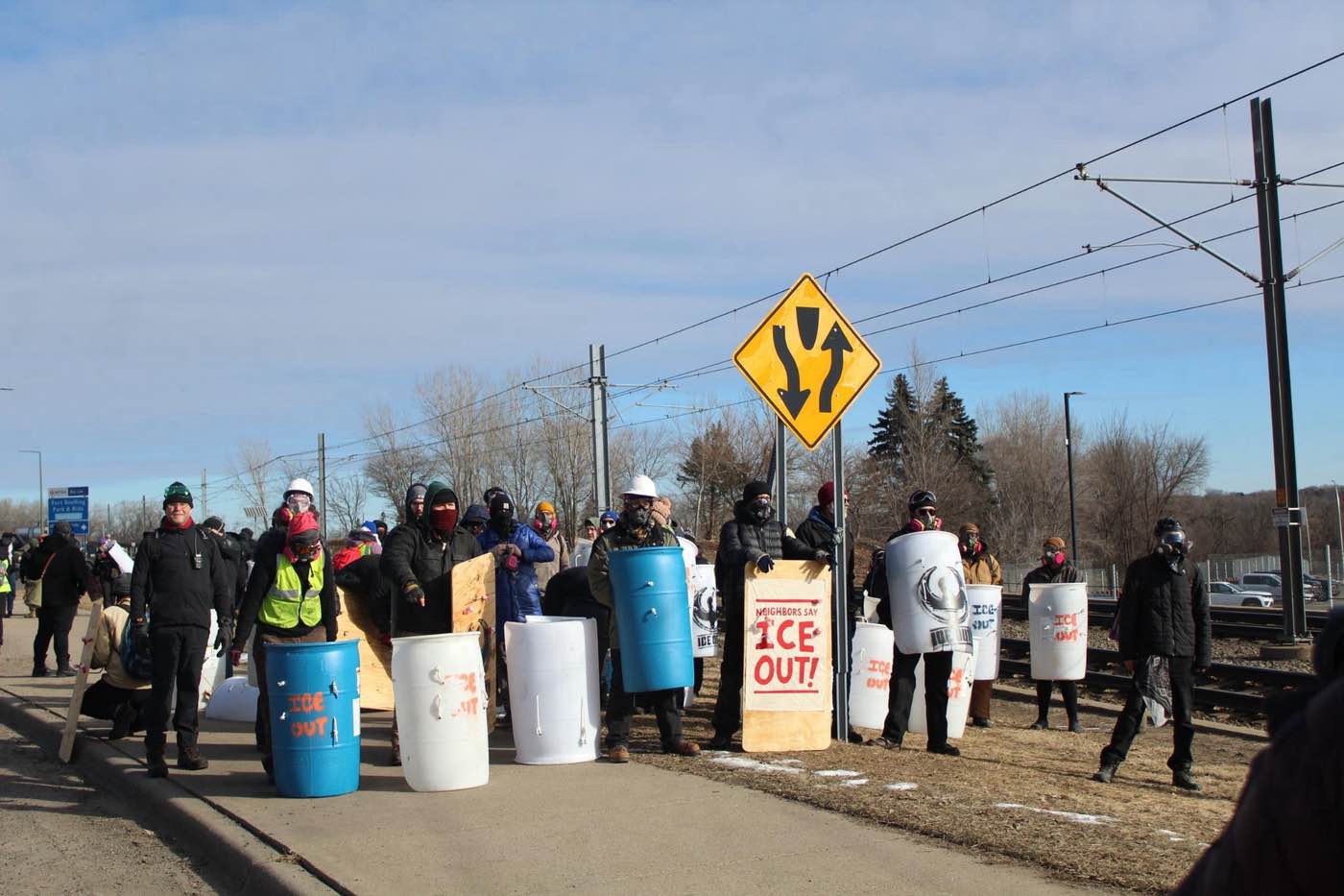 The next ten minutes felt like hours. The sheriffs kept their distance now. I think they were calling for reinforcements. Four vehicles blocked the road in front of us, and two blocked the intersection of Minnehaha and Hiawatha behind us. I was afraid we were going to get kettled. We huddled together in the freezing wind, crouching behind our few remaining shields. A middle-aged woman pulled up her car behind us. For a moment, I thought she could be ICE. Then she yelled out her drivers’ side window: “You guys are all so hot and brave!!!”