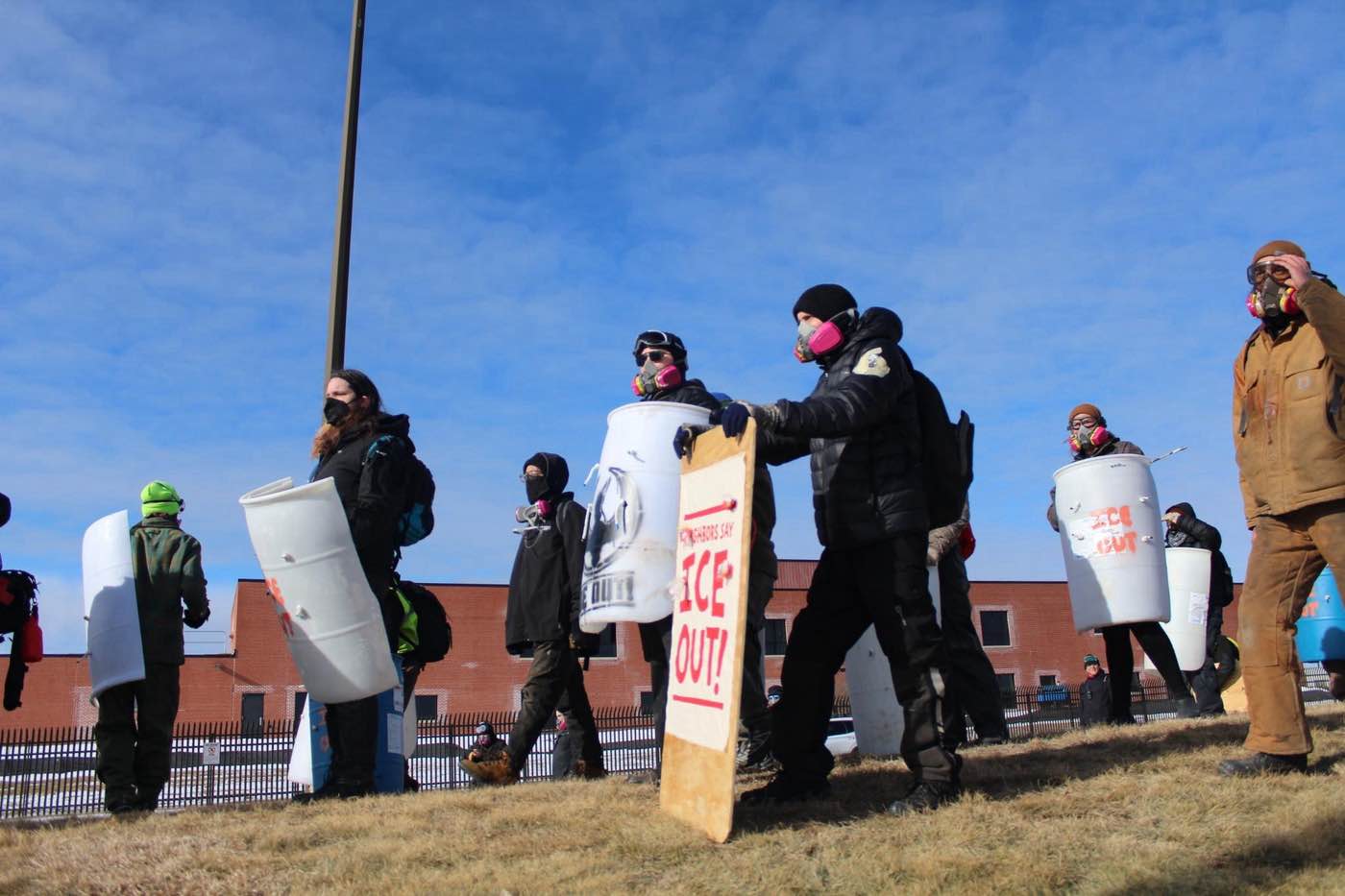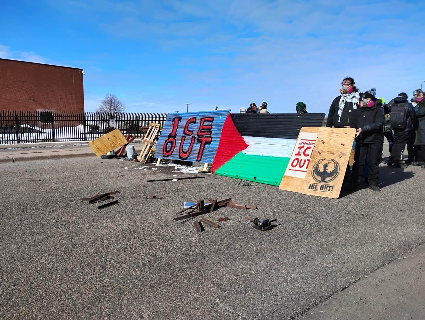 On March 1, 2026, at the conclusion of a week of action against the Immigration and Customs Enforcement occupation of the Twin Cities, protesters converged on the Bishop Henry Whipple Federal Building in Fort Snelling, Minnesota. At least four hundred people marched on the southeast side of the building to demand that ICE withdraw from Minnesota and that the land Fort Snelling occupies be given back to the Dakota people. Many Native people participated in the march, including members of the Dakota, Ojibwe, and Chippewa tribes. On the opposite end of the building, a group of fifty protesters blockaded Minnehaha Avenue with shields, reinforced banners, homemade tank traps, and improvised barricades.