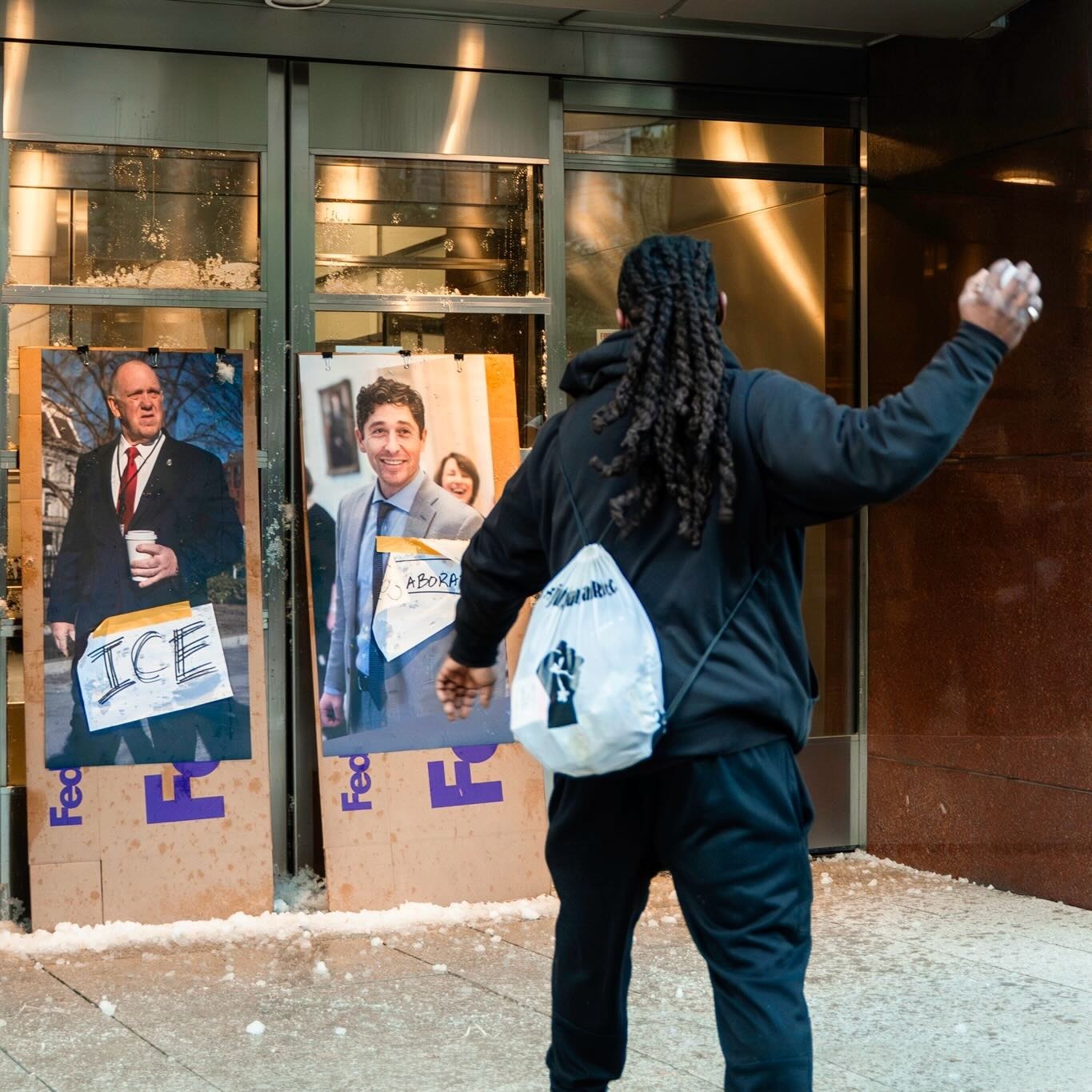 Our actions were hosted by a variety of organizations. Some actions were somewhat less confrontational, such as a rally at the State Capitol and an open mic at the Whipple Federal Building. On Friday, February 27, a “March against ICE Collaborators” snaked through downtown, stopping at various corporate targets—including Target’s corporate headquarters, Hilton, Enterprise, CBS News, and a construction firm called United Properties, not to mention the Hennepin County Jail. Marchers covered the streets with slogans in chalk, and ended by throwing snowballs at effigies of Mayor Jacob Frey and “Border Czar” Tom Homan.