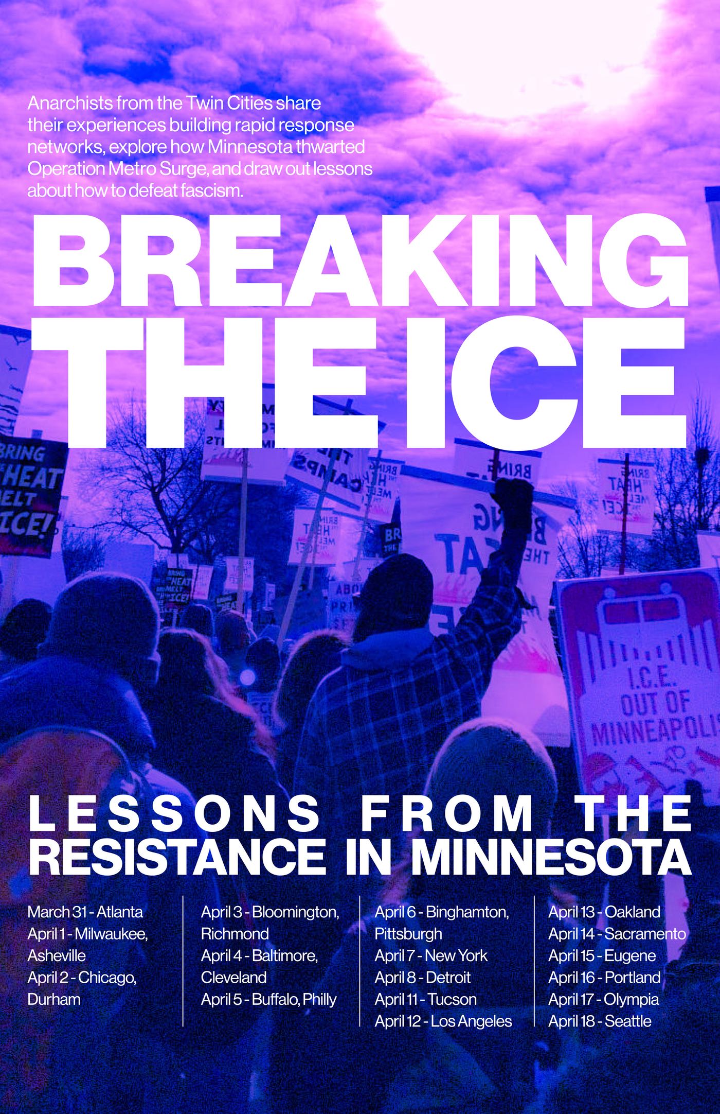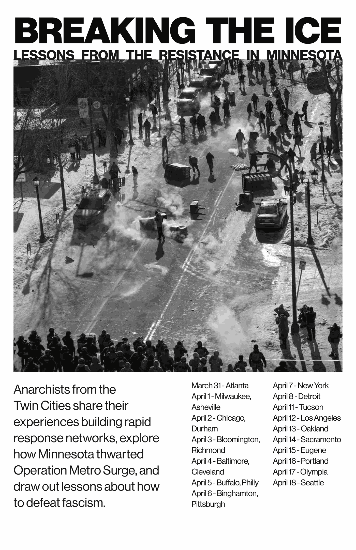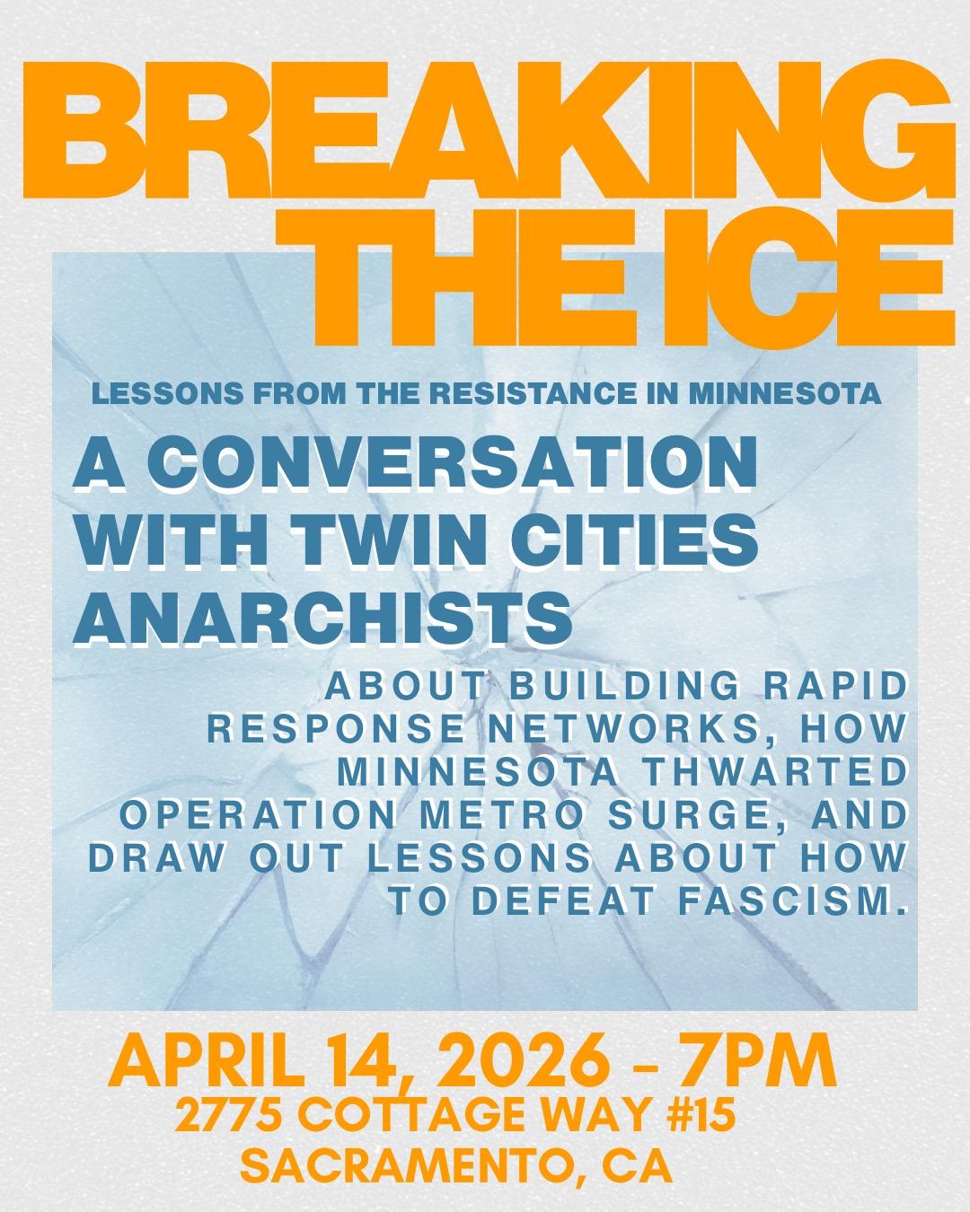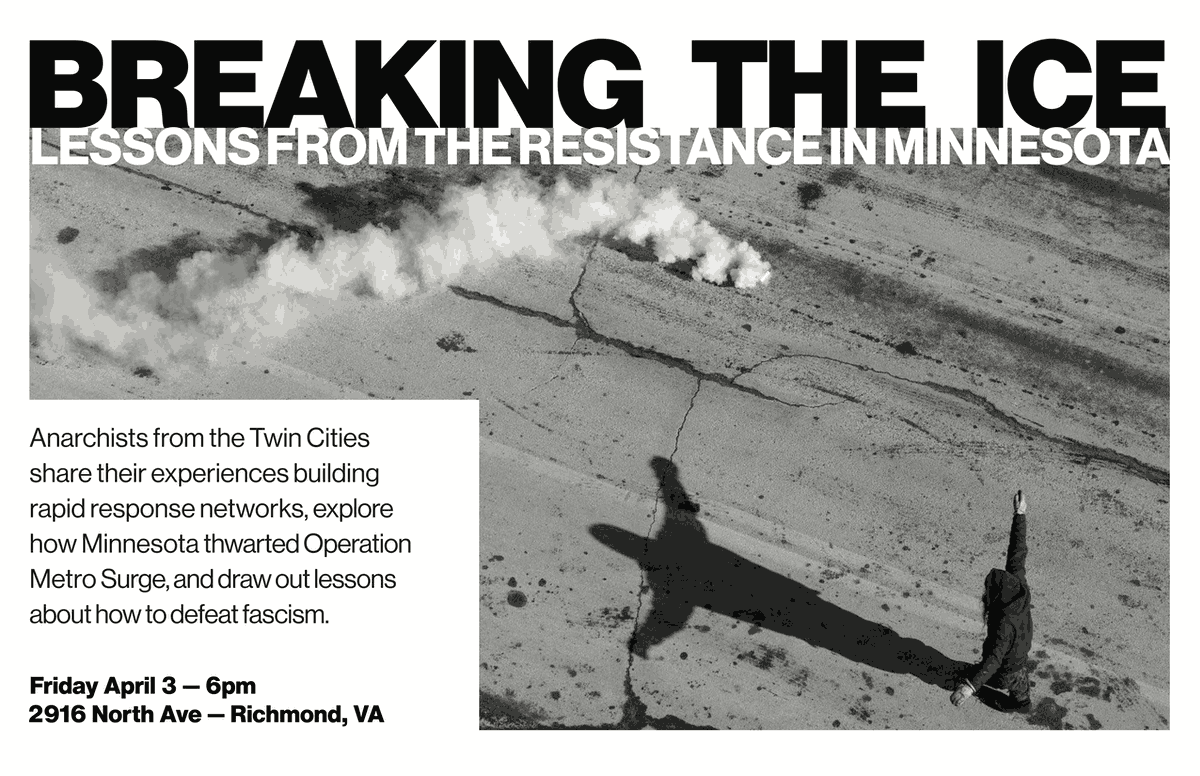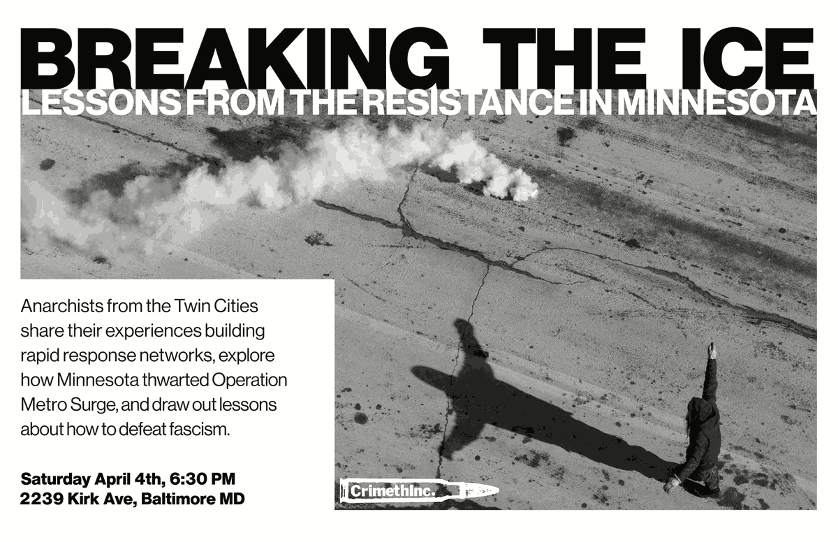 In April, anarchists from the Twin Cities who have participated in resisting the ICE occupation there will travel the country speaking on their experiences. At each presentation, they will share what they have learned from building rapid response networks, explore how Minnesota thwarted Operation Metro Surge, and draw out lessons about how to defeat fascism.