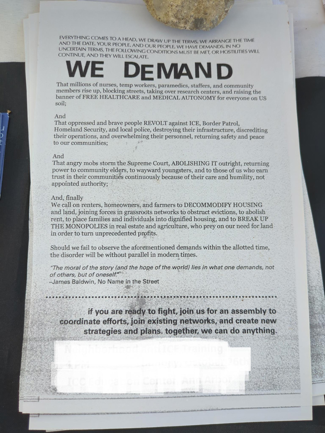 Our propaganda encourages direct action and political experimentation. The flyers all have a QR code for an “announcements” signal thread that posts upcoming antiauthoritarian events, our own marches, and the like. But we don’t have a specific upcoming event on our calendar this month which invites public participation, for example, we haven’t made a call for the formation of a citywide assembly. Those kind of things are yet to be organized.