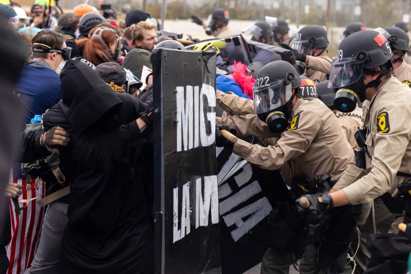 Illinois police brutalizing demonstrators at the Broadview ICE facility on November 1. Photograph courtesy of Andres A. Chavez.