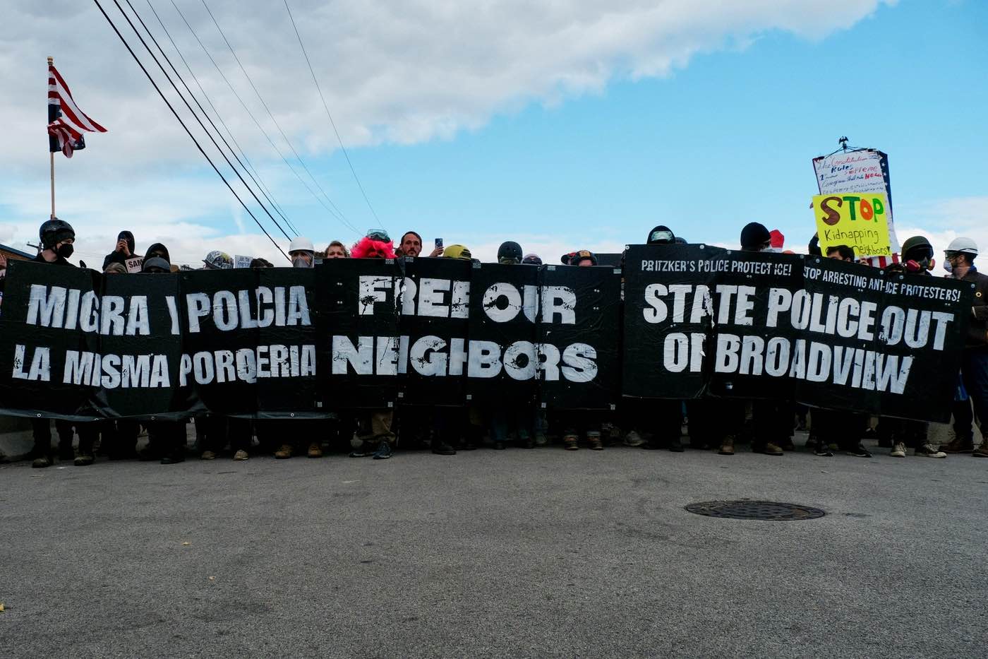 After a particularly rowdy demo on September 26, it became clear that ICE could not maintain the perimeter around the Broadivew facility without constantly tear-gassing protesters—a tactic that annoyed neighbors and local community members and generally created the impression that local politicians had lost control of their territory. In response, Illinois governor Jay Robert “JB” Pritzker and Broadview mayor Katrina Thompson sent in state and local police to secure the area.